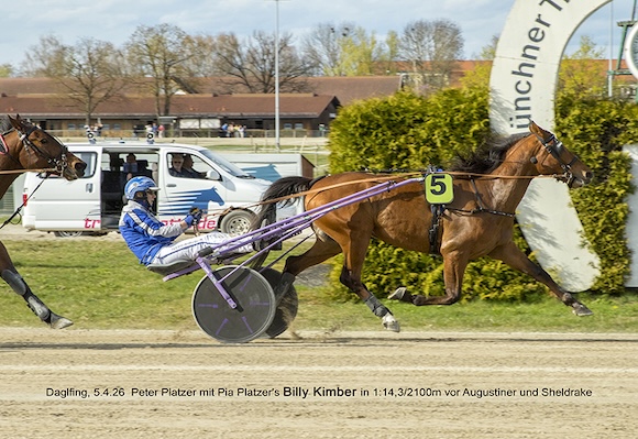 Keine Opposition gab es auch für Billy Kimber (P. Platzer). Der Wallach wurde seiner Favoritenstellung gerecht, entwischte dem Feld im Schlussbogen und geriet durch Augustiner (Dr. C. Schulz) und den zum Schluss kräftig sprintenden Sheldrake (R. Haller) nicht in Gefahr.
