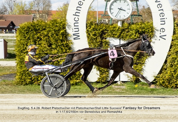 Nachdem Braxxton (R. Haller) dieses Mal keine Lust hatte am Rennen teilzunehmen und von der Rennleitung konsequent, wegen Ungebärdigkeit vom Start verwiesen wurde, war der Weg für einen Sieg von Fantasy for Dreamers (R. Pletschacher) frei. Der Rubino degli Dei-Nachkomme agierte sehr souverän und siegte gegen Benedictus (C. Fischer) und Romashka (H.-J. Just).