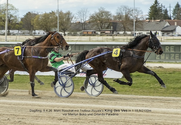 Nach sehr zügiger Fahrt an der Spitze musste sich Orlando Paladino (R. Lindinger) in der Endabrechnung mit Rang drei begnügen. Den Sieg sicherte sich trotz eines kurzen Rumplers im ersten Bogen King des Ves (M. Raschat) der Marilyn Boko (Dr. C. Schulz) im Einlauf sicher auf Rang zwei verwies.