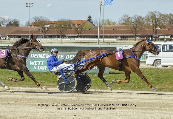 Ein hitziges Duell an der Spitze lieferten sich zum Auftakt der V6-Wette Miss Red Lady (S. Hiendlmeier) und Postillion (P. Platzer). Der mit Zulage gehandicapte Platzer-Crack stellte den Anschluss an die Spitze schnell her, drückte unterwegs gegen die Pilotin massiv auf die Fahrt und musste dem Pensum auf den letzten 200 m Tribut zollen, wogegen die Stute durchzog und bis zur Linie einen Vorteil behielt. Nutzen aus der Schwäche des Trainingsgefährten konnte Xalina B ziehen, die von Dr. Conny Schulz an der Innenkante gehalten wurde und im Einlauf noch mächtig schnell wurde sodass der Ehrenplatz auf das Konto der Kriterium-Siegerin ging.