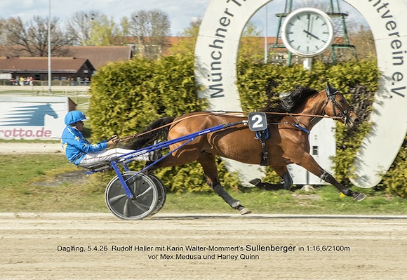 Mit einem weiteren Schützling aus dem KWM-Lot, lief es für Rudi Haller wenig später dagegen wie am Schnürchen. Der vierjährige Sullenberger, ein Face Time Bourbon-Nachkomme aus der Zucht von Arne Fiedler, zeigte eine bärenstarke Vorstellung beim Debüt und siegte wie ein Pferd besserer Klasse in starken 1:16,6 / 2.100 m vor Mex Medusa (M. Gramüller) und Harley Quinn (R. Pletschacher).